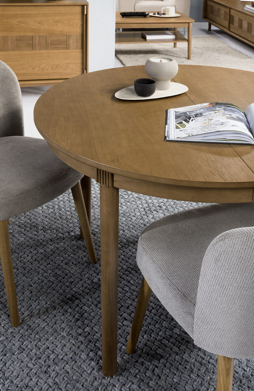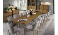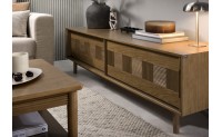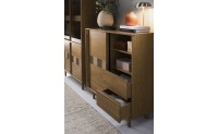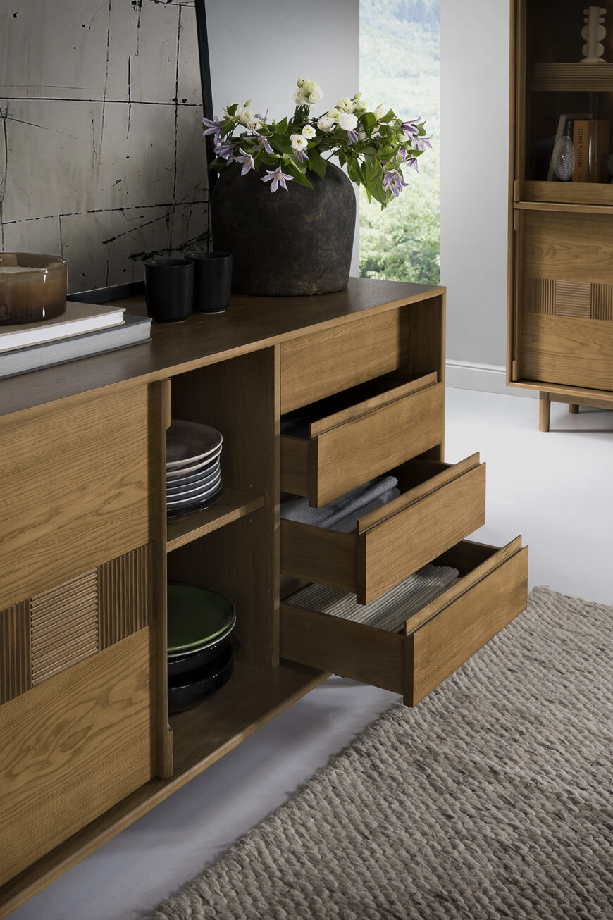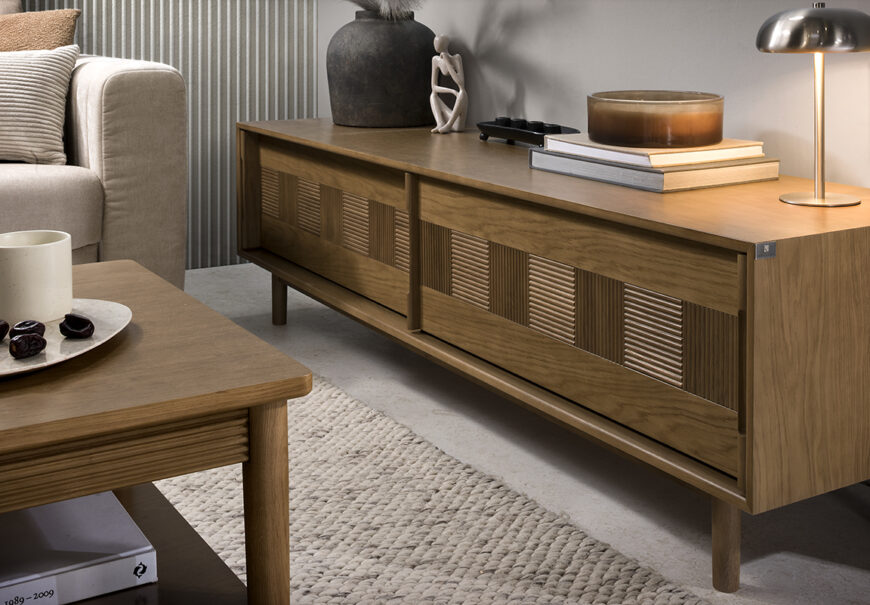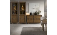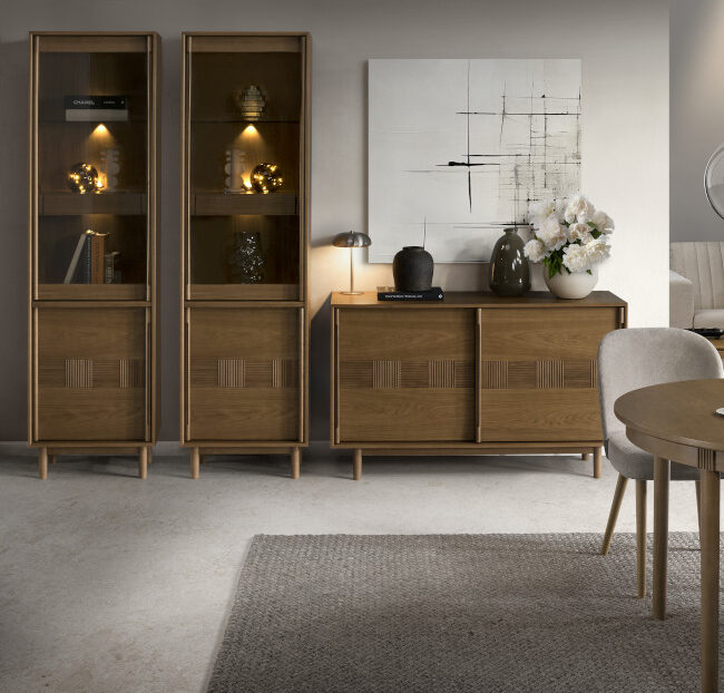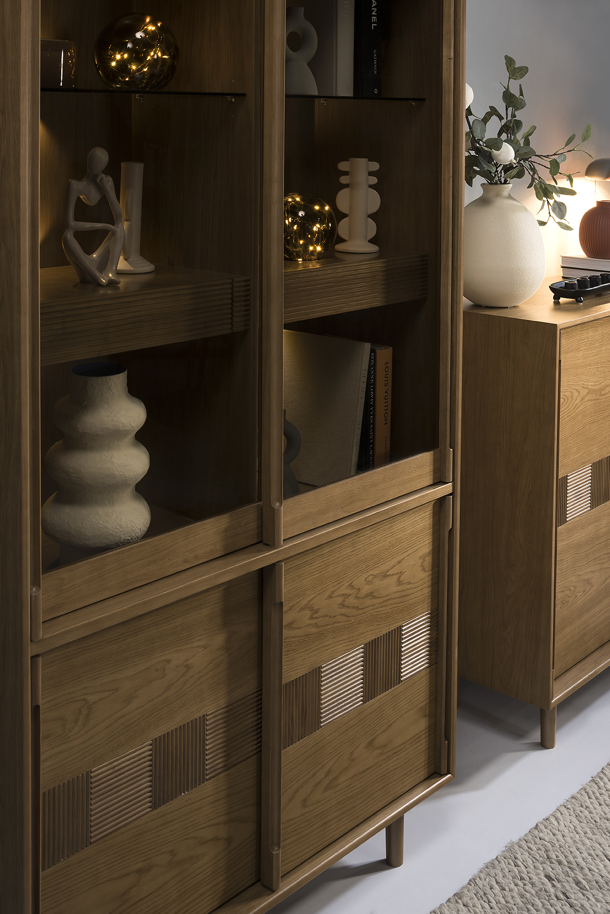 Základem této kolekce jsou posuvná dvířka a masivní nohy které dodávají nábytku retro vzhled. Nožky mají také svůj praktický význam protože umožňují udržovat větší čistotu v místnosti. Dále si všimněte nápadité propracovanosti kdy za dvířky jsou v některých částech umístěny praktické šuplíky.