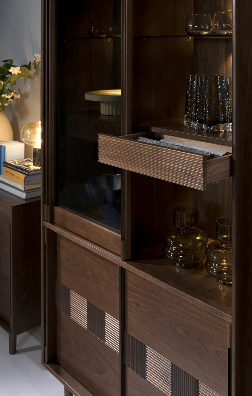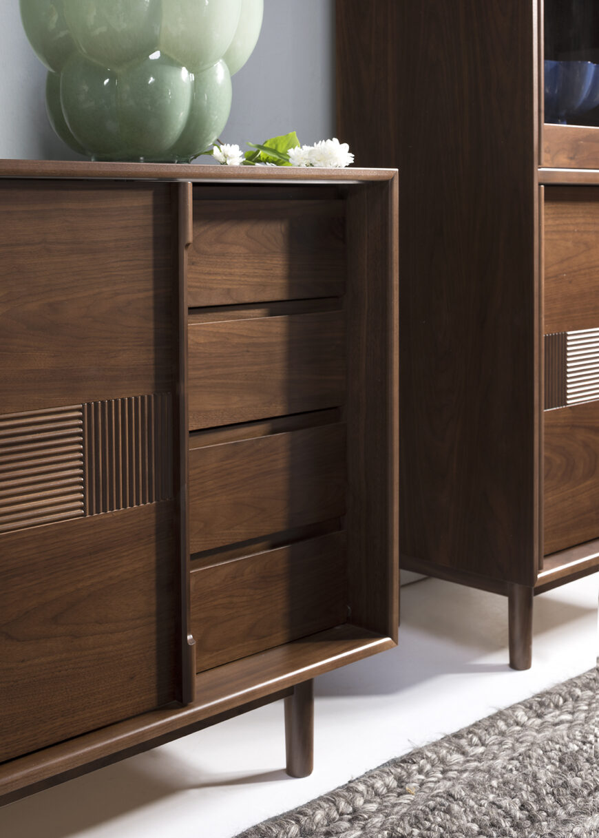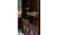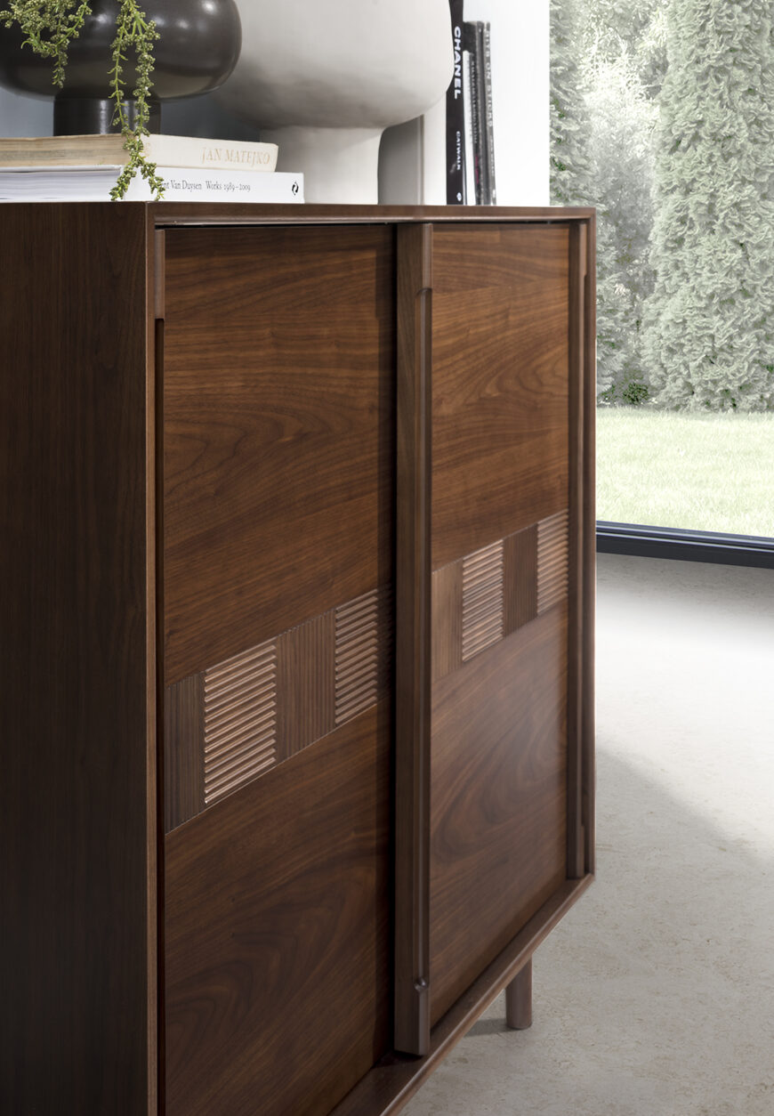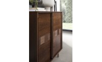 Základem této kolekce jsou posuvná dvířka a masivní nohy které dodávají nábytku retro vzhled. Nožky mají také svůj praktický význam protože umožňují udržovat větší čistotu v místnosti. Dále si všimněte nápadité propracovanosti kdy za dvířky jsou v některých částech umístěny praktické šuplíky.