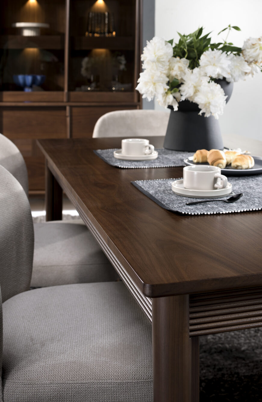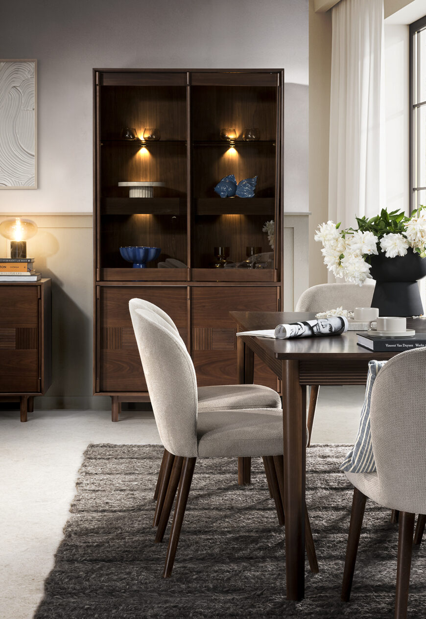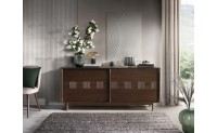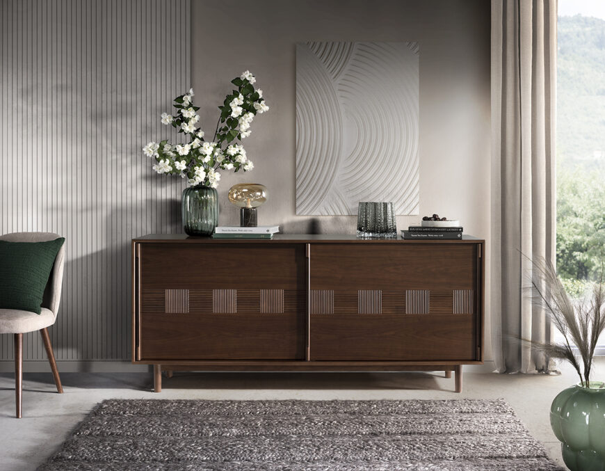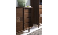 Základem této kolekce jsou posuvná dvířka a masivní nohy které dodávají nábytku retro vzhled. Nožky mají také svůj praktický význam protože umožňují udržovat větší čistotu v místnosti. Dále si všimněte nápadité propracovanosti kdy za dvířky jsou v některých částech umístěny praktické šuplíky.