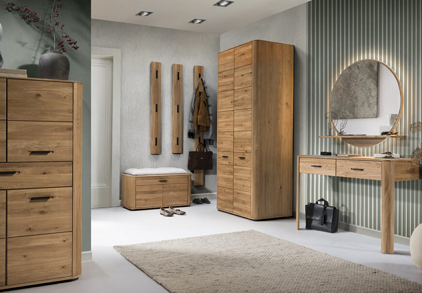 Luxusní předsíňový nábytek v kvalitním provedení dubového masivu v kombinaci s dubovou dýhou kde hlavní viditelné části jsou masiv.